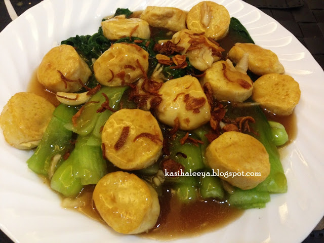 potong tofu macam Kak Pilla buat tu.. panaskan sedikit minyak dan goreng hingga perang.. angkat dan asingkan.. celurkan sayur hingga masak, angkat toskan dan susun atas pinggan lawa-lawa.. Kemudian panaskan 1 sudu minyak.. tumiskan bawang putih hingga perang dan wangi.. kemudian masukkan oyster sauce dan gaul rata.. kemudian tuangkan secawan air.. kalau masih tawar boleh letak sedikit garam.. dan tuangkan bancuhan tepung jagung sehingga kuah menjadi sedikit likat / pekat.. tutup api dan tuangkan kuah ke atas sayur dan tofu jepun.. taburkan bawang goreng sebagai hiasan..